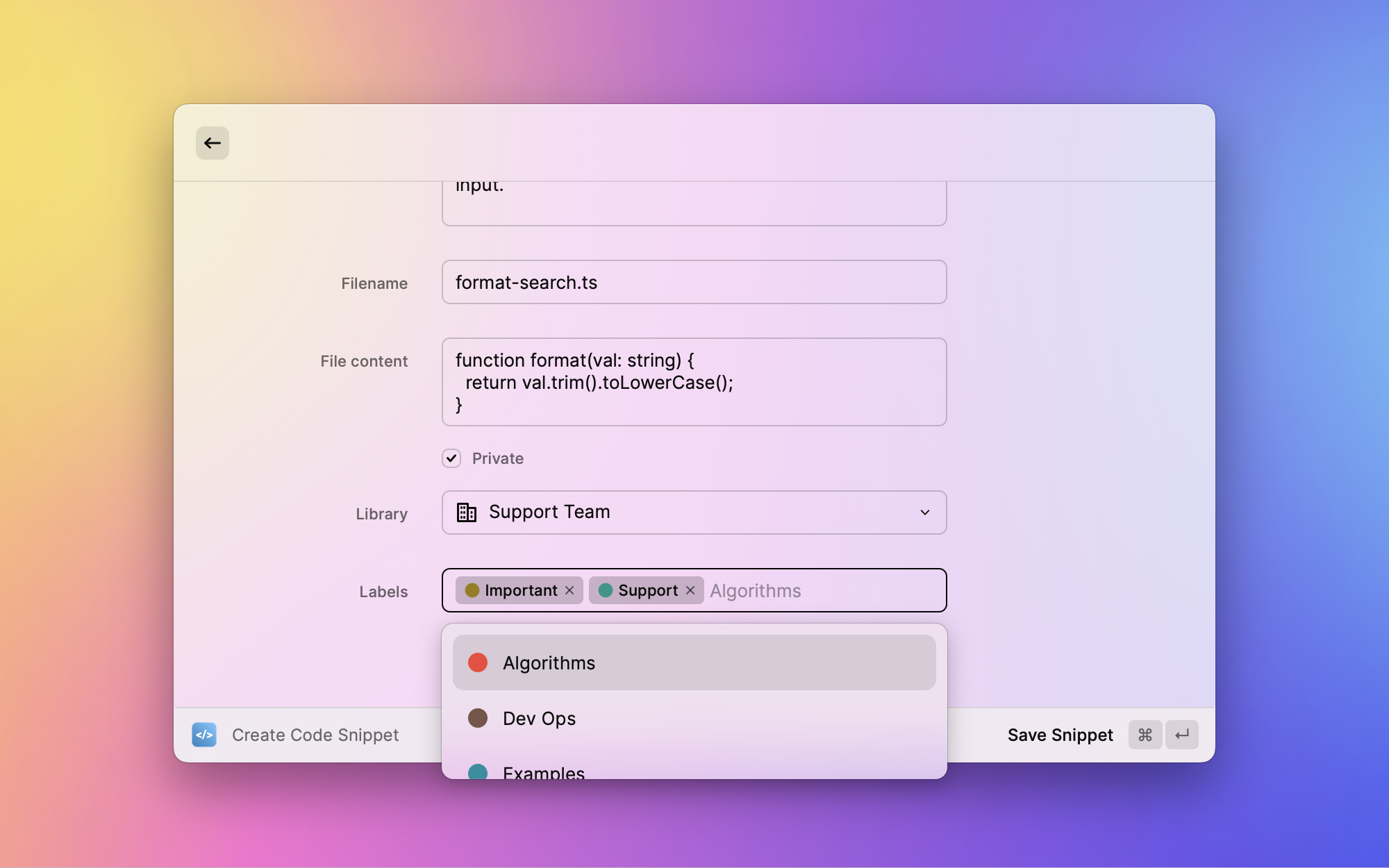 Create a new snippet and add it to your Cacher personal or team library. Assign one or more labels and give it an optional description.